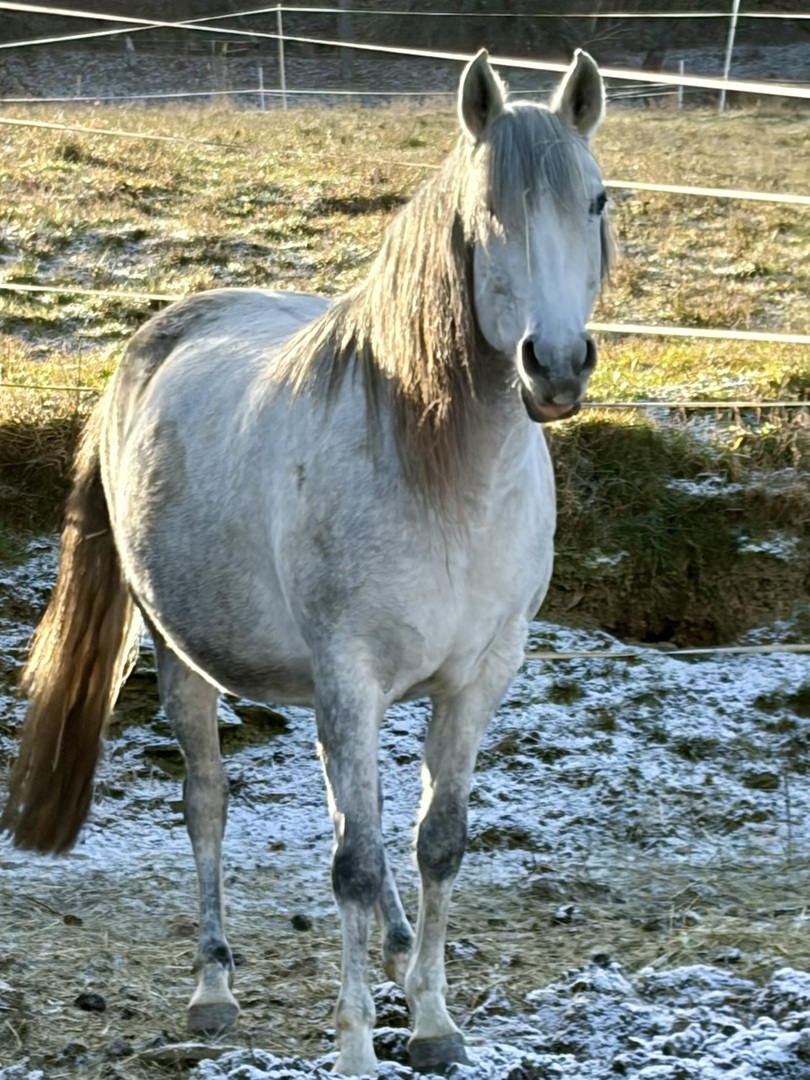 Arnak ist Schimmel mit Farbgen, kann daher auch farbige Fohlen bekommen.